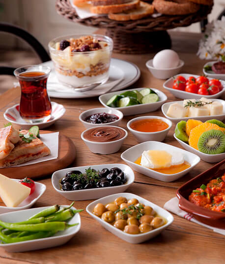 Beyaz Peynir, Kaşar, Çeçil, Örgü, Reçel, Bal, Mihaliç, Kaymak, Tereyağı, Zeytinler, Çikolata, Salam, Sigara Böreği, Zeytin Yağlı Sarma, Mercimek Köfte, Cips, Su Böreği, Domates, Salatalık, Sucuklu Yumurta